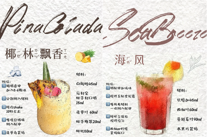 社交媒体上,鸡尾酒的关键词是“仙女酒”“拍照神器”“仪式感拉满”,比如,粉紫渐变的“玫瑰特调”、像极了夏日傍晚那片晚霞的“落日飞车”、飘着金箔的“月光酒”、插着小花的“春日限定”——每一杯都像“捧在手心的艺术品”,个个都有着超高的颜值,让人跃跃欲试。
