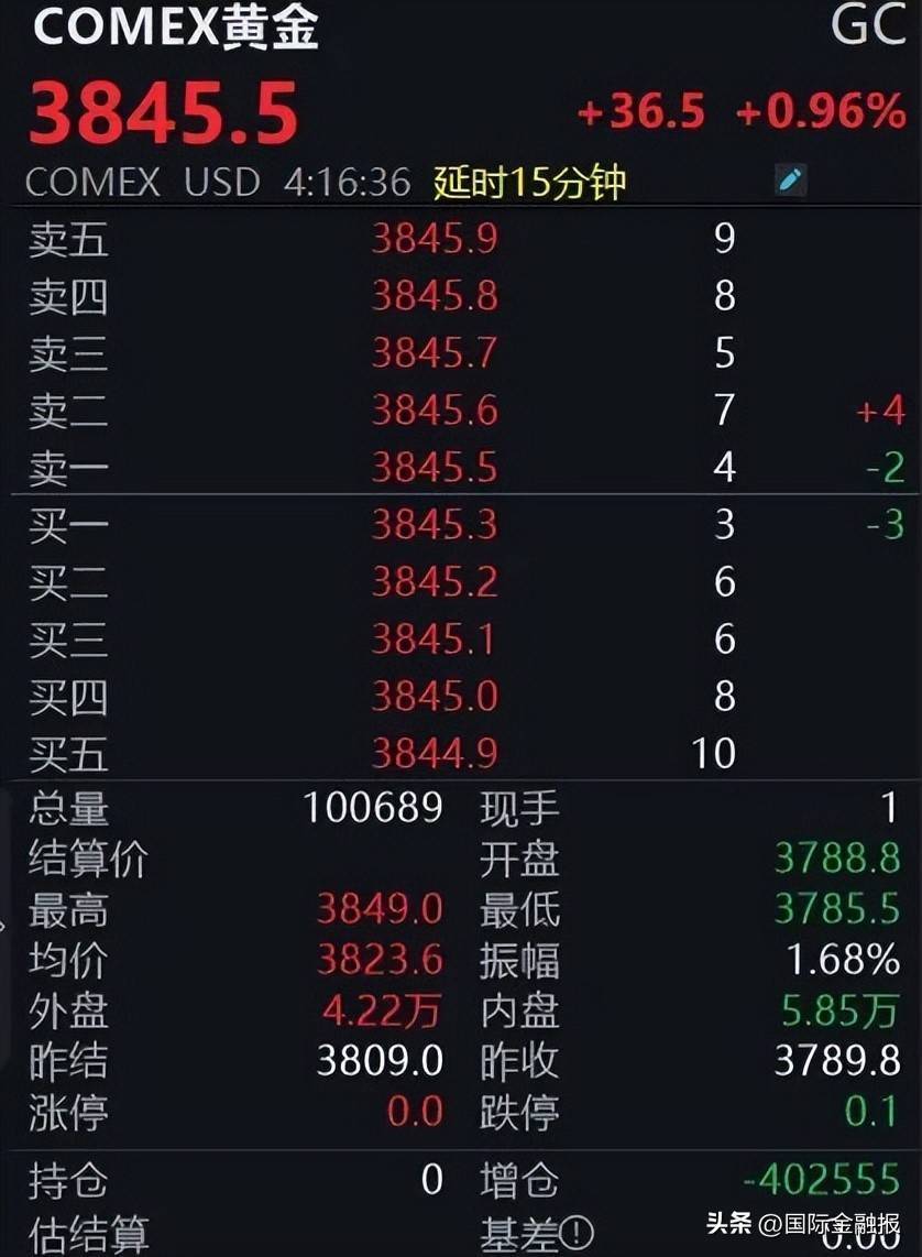 期货方面,COMEX黄金期货也迎来大涨。截至记者发稿,COMEX黄金期货日内涨0.96%,报3845.5美元/盎司,盘中一度触及3849美元/盎司。