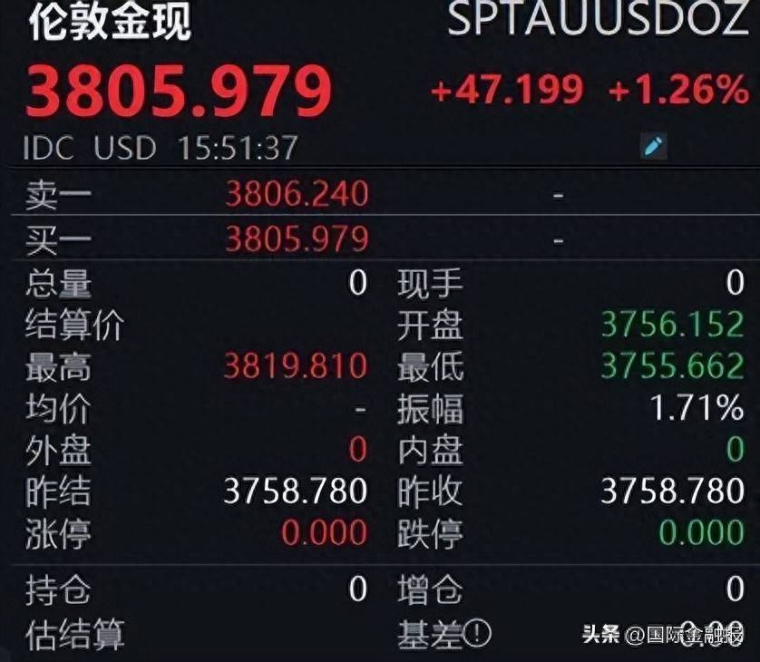 9月29日,现货黄金首次升穿3800美元/盎司,再次刷新历史纪录。截至记者发稿,现货黄金报3805.979美元/盎司,日内涨1.26%,盘中最高触及3819.81美元/盎司。